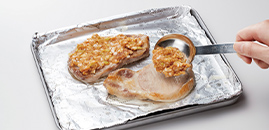 アルミホイルを敷いた天板に1をのせて、トースターで7~8分焼いてから、表面に2を塗って、こんがり焼き目がつくまでさらに3~4分加熱する。